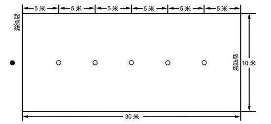 在坚实、平整场地或足球场进行,测试区域长30米,宽10米,在起点线至第一杆距离为5米,各杆间距5米,共设5根标志杆,标杆距两侧边线各5米,测试用球为(5号球)。考生从起点线通过“S”型绕过所有标志杆,并通过终点线为结束。