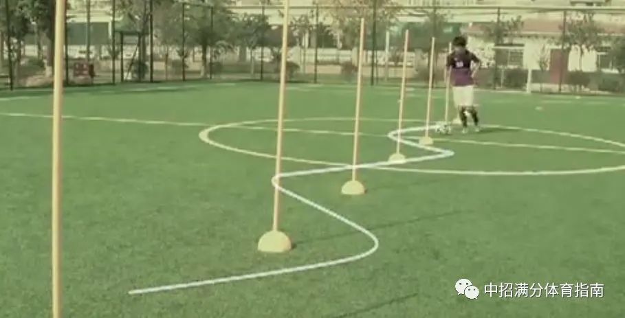 足球绕杆考试,每人测试两次,记录较好成绩。考生考试时犯规,当次成绩无效,减少一次考试机会。