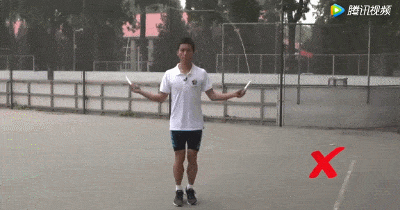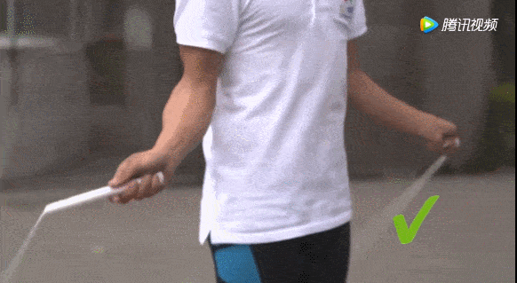 2.摇绳的主要发力部位是手腕,握在绳柄中后端。两手臂贴近身体,手腕用力,减少绳运行周长。两手心不可朝上,尽量向下或者相对、手心朝下更能发力。