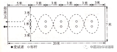 测试场地需设置在篮球场内或者平整的塑胶场地上,具体设置要求如下:考试场地长20米,宽7米。起点线前5米处开始设置标志杆,共设5排,每排2根;各排标志杆之间相距3米,同排的两根标志杆底座中心点之间相距1米,距同侧边线3米。测试器材包括秒表、发令哨、30米卷尺、标志杆10根(杆高不低于1.2米)、篮球。