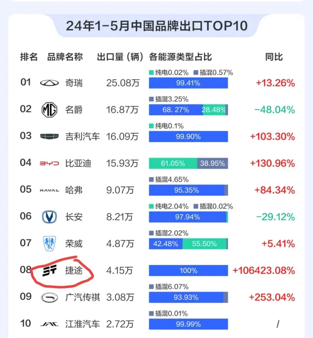 2024年1-5月份,奇瑞子品牌捷途,总计出口量达到了4.15万台,同比暴涨1064倍,其中捷途旅行者是该品牌出口量最大的单一车型,最受俄罗斯和中东老外欢迎。