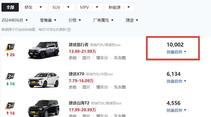 捷途旅行者最新6月在国内的销量达到了10002辆,同期出口超6000台,但产能严重不足,国内这款车等车时间超3个月,严重供不应求。