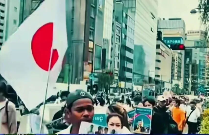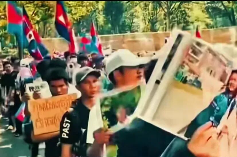 (柬埔寨的反对者的游行队伍里竟然还挥舞着日本国旗。)