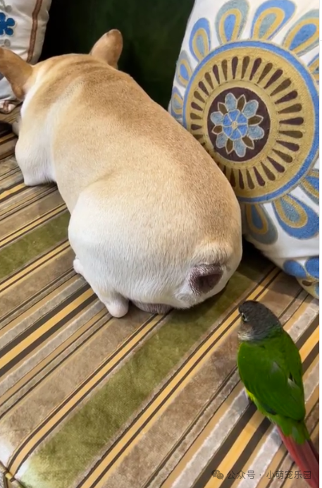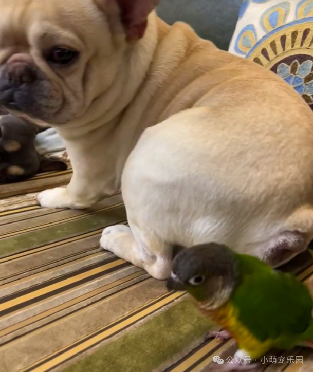狗狗那一脸的疑惑和不解,鹦鹉那一脸的尴尬和不好意思,这俩小家伙的互动,简直就像是在演一出戏。