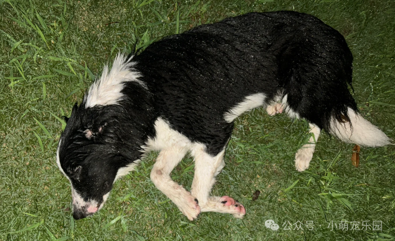 走失边牧,不知道在外头受了多少苦,它就那么那么倔强地躺在草地上淋着雨,怎么劝也不肯进楼道躲雨。给它吃的,它连看都不看一眼,情绪低落得很。我心想,这孩子,是不是心里委屈啊?
