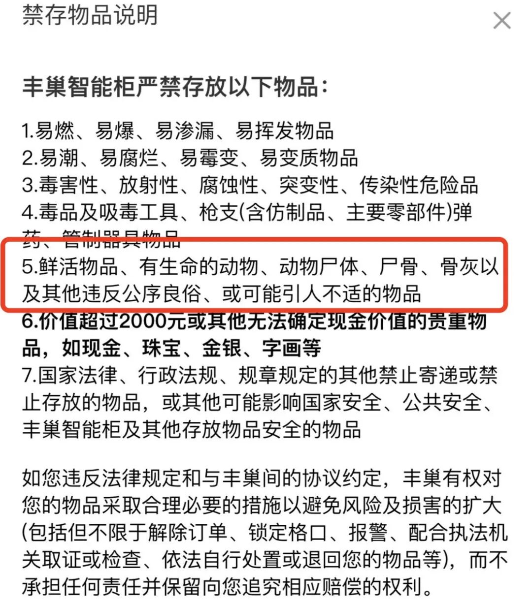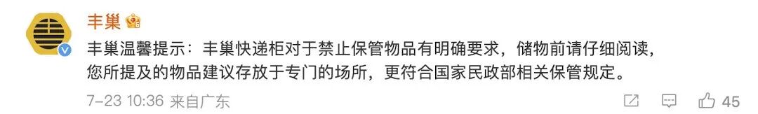 同时,丰巢也在微博评论中表示,“丰巢快递柜对于禁止保管物品有明确要求,储物前请仔细阅读,您所提及的物品建议存放于专门的场所,更符合国家民政部相关保管规定。”