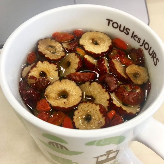 1. 把食材放到杯子里,用开水焖半个小时到一个小时即可;