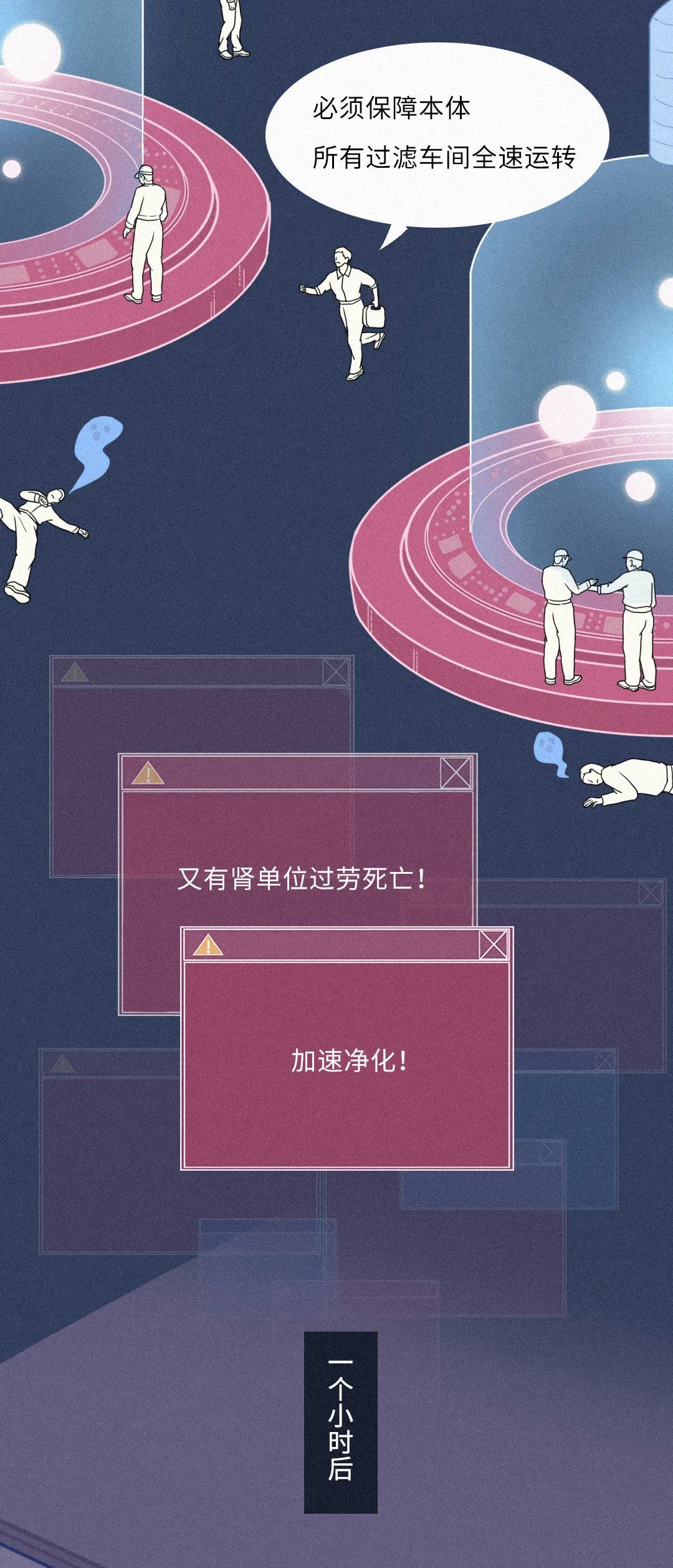 肾工厂是典型的模范工厂,全年无休。一周工作 7 天,一天工作 24 小时。心脏的每一次搏动,多达 20%~25% 的血液流经肾脏。每一分钟过滤 1 升,仅仅 1 小时,便能把全身的血液过滤 12 遍。