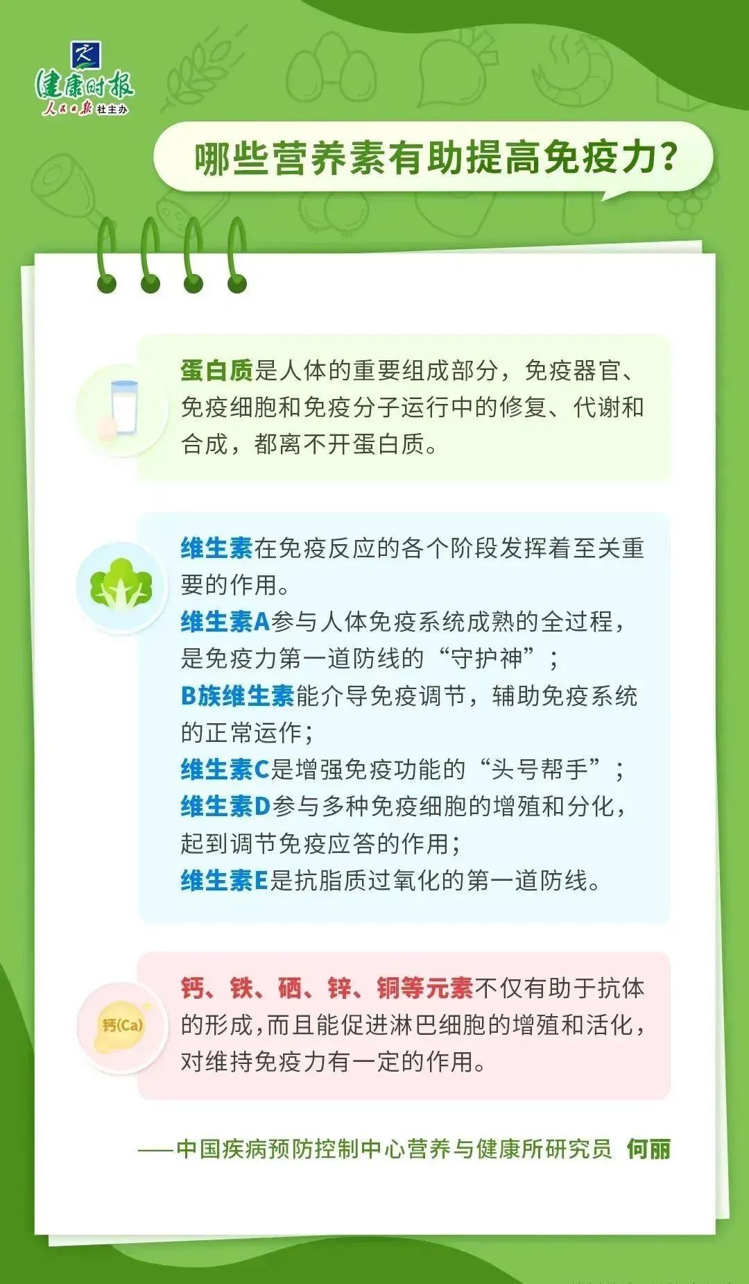 维生素和矿物质会影响免疫细胞的数量和活力,平时要多吃新鲜蔬菜水果等,有益于提高免疫力。