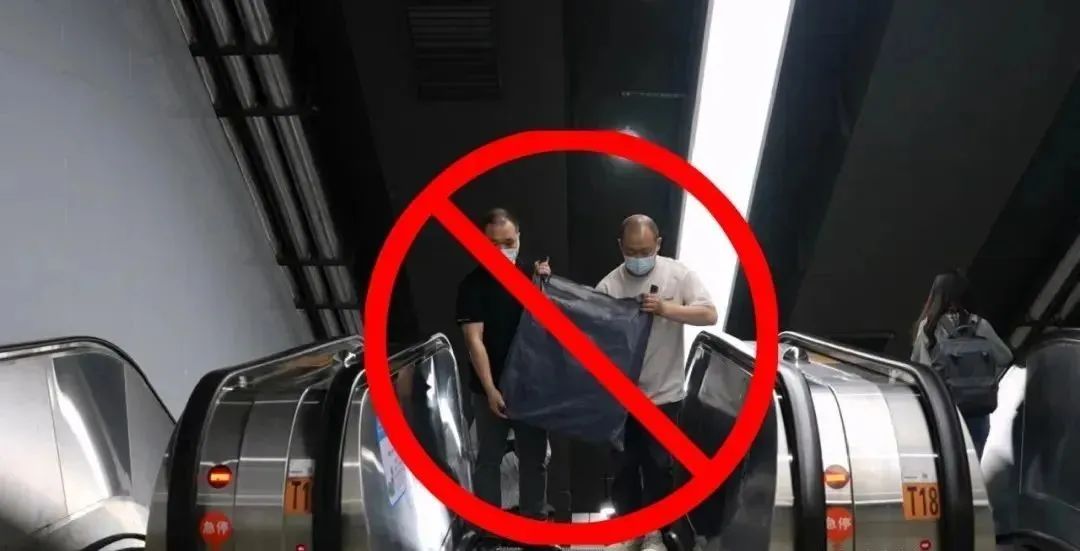 ④携带大件行李乘坐扶梯时,容易因行动不便导致摔倒或行李滑落伤人。为保护自身及他人的安全,携带大件行李,使用轮椅车、婴儿推车或行动不便的乘客,请选择乘坐无障碍电梯,或向地铁工作人员寻求帮助。