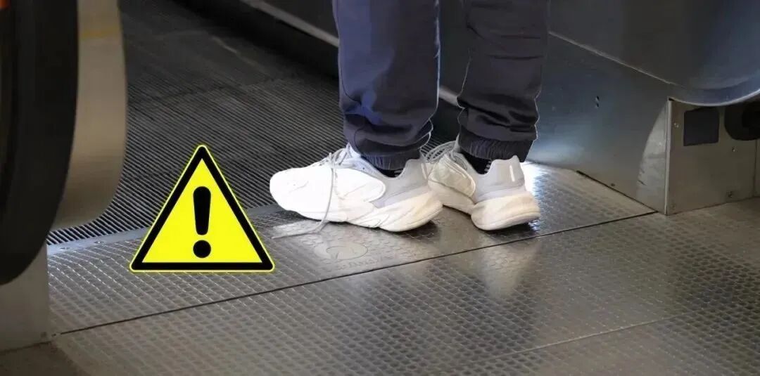 自动扶梯梳齿板与梯级、围裙板与梯级、梯级与梯级的间隙,容易卷吸衣服裙摆或材质柔软的鞋子,请勿在这些区域站立或停留。