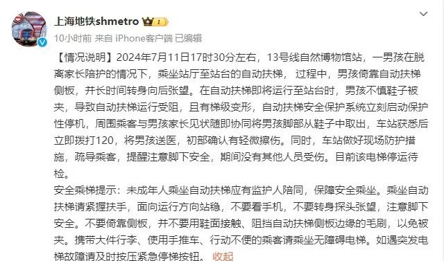 2024年7月11日17时30分左右,13号线自然博物馆站,一男孩在脱离家长陪护的情况下,乘坐站厅至站台的自动扶梯, 过程中,男孩倚靠自动扶梯侧板,并长时间转身向后张望。在自动扶梯即将运行至站台时,男孩不慎鞋子被夹,导致自动扶梯运行受阻,且有梯级变形,自动扶梯安全保护系统立刻启动保护性停机,周围乘客与男孩家长见状随即协同将男孩脚部从鞋子中取出,车站获悉后立即拨打120,将男孩送医,初步确认有轻微擦伤。同时,车站做好现场防护措施,疏导乘客,提醒注意脚下安全,期间没有其他人员受伤。目前该电梯停运待检。