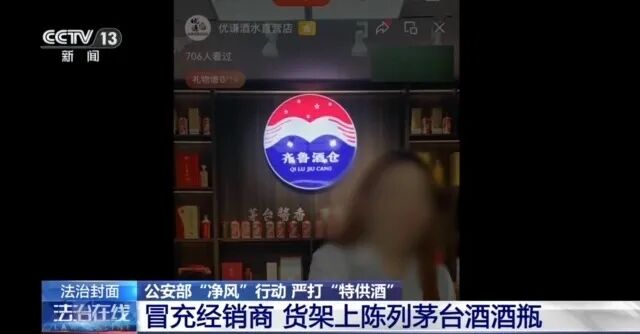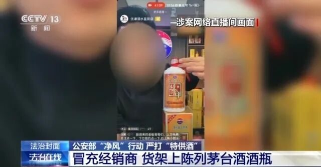 办案民警还注意到,在直播间中,主播身后的标志和贵州茅台酒品牌的标志十分相似,而且在销售人员背后的货架上也几乎是清一色的茅台酒酒瓶。