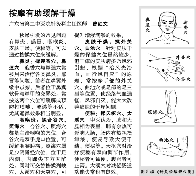 秋燥引发的常见问题有鼻炎、感冒、咽喉炎、皮肤干燥、便秘等,可以通过按揉穴位来缓解。