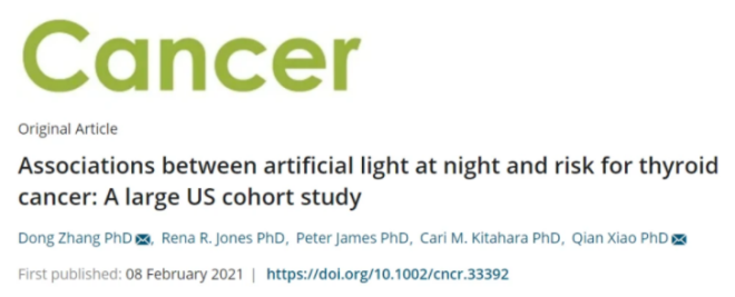 2021年2月一项来自《Cancer》的研究表明,夜间灯光较为明亮可增加罹患甲状腺癌的风险。研究者认为,其原因是夜间灯光的暴露破坏了人体的生物钟。