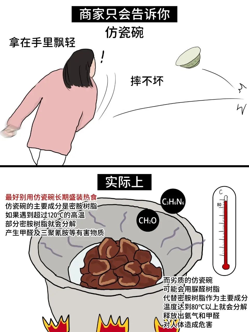 其实选餐具也得当“成分党”,就拿最常见的瓷质餐具来说,有些商家宣传的所谓“耐摔仿瓷碗”“轻巧儿童碗”,主要成分是密胺树脂,需要注意盛放的食物温度。如果遇到超过120℃的高温,部分密胺树脂可能会分解,产生甲醛及三聚氰胺等有害物质。而劣质的仿瓷碗,可能会用脲醛树脂代替密胺树脂作为主要成分,温度达到80℃以上就会分解,释放出氨气和甲醛。另外,饭店打包带回来的塑料餐盒能不能重复使用,需要看它是哪类塑料制品。塑料餐具、保鲜盒一般是聚丙烯(PP)材质的,标有国标数字5,这样的餐盒在100℃以下使用是安全的,也能在微波炉中短时加热。而标有数字6的是一次性餐盒,不能反复加热,更不适用于微波炉。你最常用的餐具是什么样的?