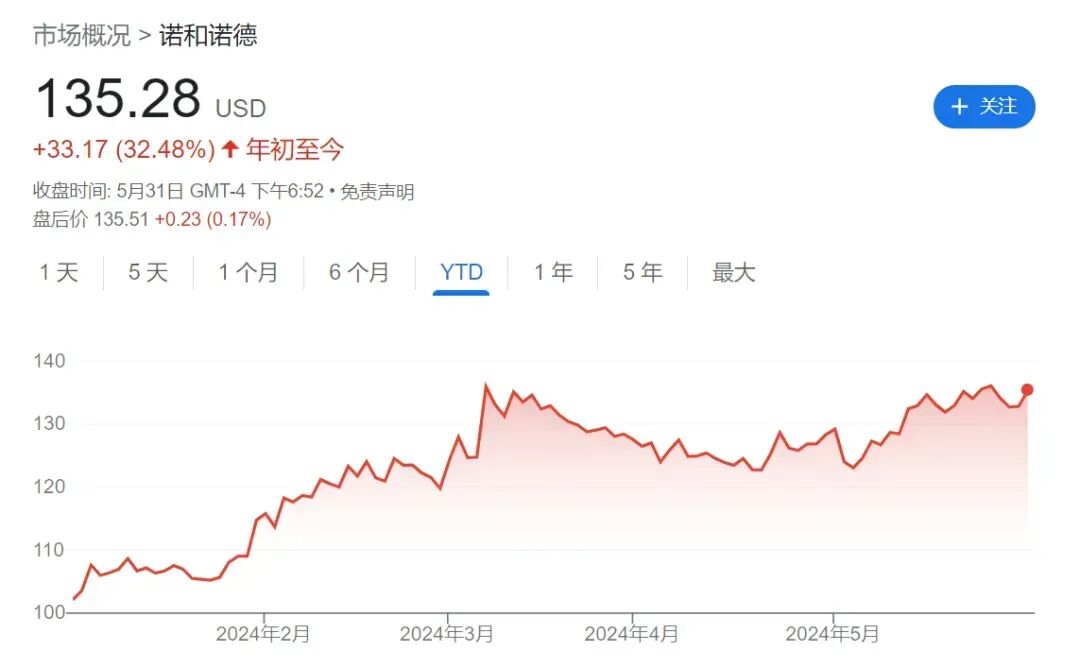 火爆的司美格鲁肽也让生物制药公司诺和诺德在减肥药领域抢得先机,并带动其股价在过去两年大幅飙升,去年甚至一度超越路威酩轩,成为全欧洲市值最大的公司。截至发稿,诺和诺德的股价为每股135.28美元,年初至今累涨32.48%,市值为4585亿美元(约合人民币3.32万亿元)。