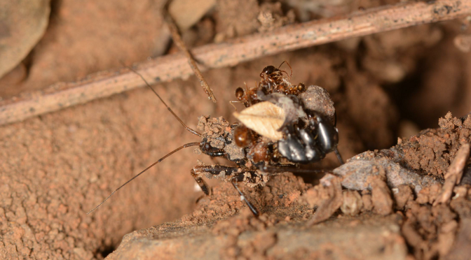 背负着蚂蚁尸体的猎蝽,疑似淡带荆猎蝽的若虫(冉浩摄)