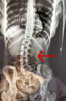 医生检查发现其脊柱严重侧弯,x光检查提示,她的腰椎向右侧弯、旋转,并以腰2椎体为中心向右侧弯,脊柱向右发生明显侧弯。