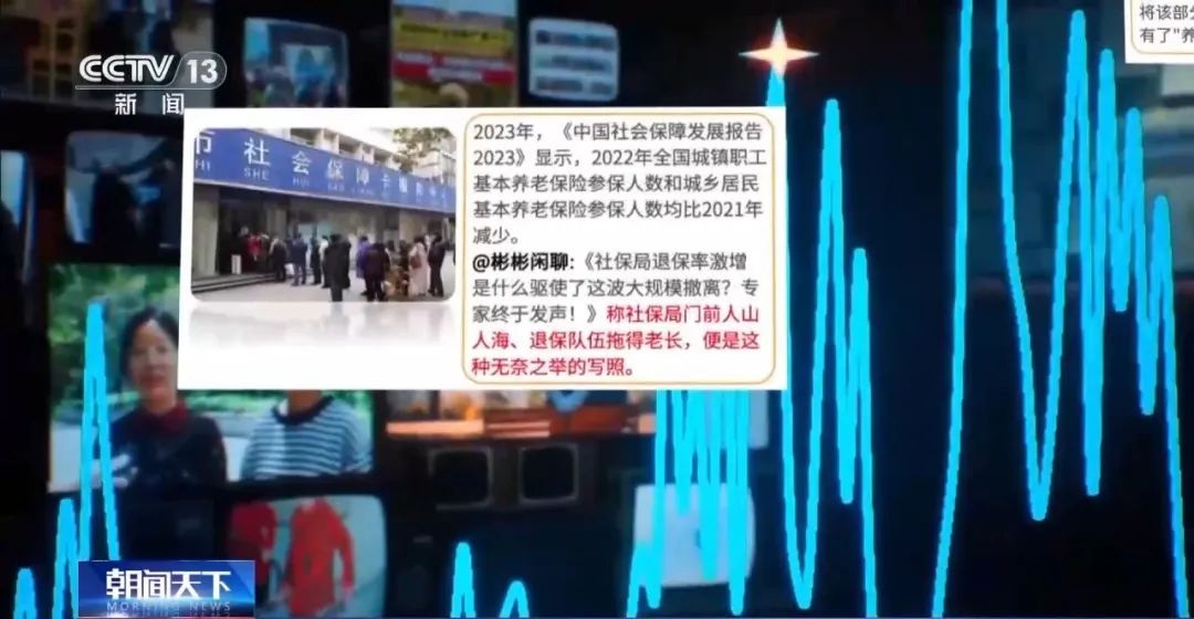 我们在时间线上还原这些消息的演变过程。首先是《中国社会保障发展报告2023》中提到个人养老金缴存比例仍不高。自媒体账号却从中提取出了“参保人员减少”;配上了一张人社部门正常接待的图片;内容加工成“社保局门前人山人海、退保队伍拖得老长”。每一个拼凑出来的爆点,都“成功”引起了舆论的关注。