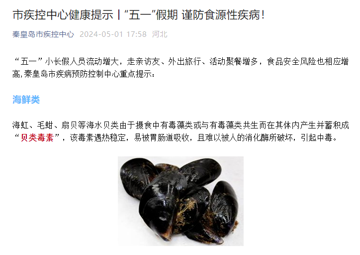 此前,河北省秦皇岛市曾出现多例食用海虹中毒案例,患者都不同程度出现乏力、恶心、呕吐、气短、胸闷、头晕等症状。临床医生询问得知,患者都是在食用自己捕捞的海虹后出现上述症状。
