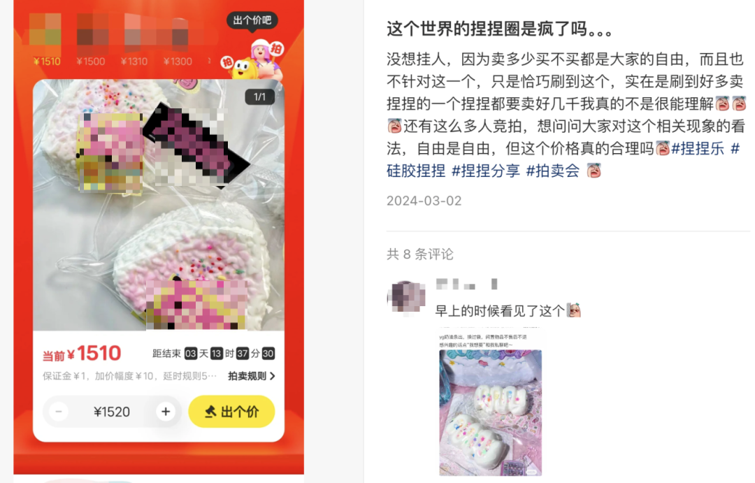 某款“捏捏”在二手平台上拍出上千元的价格。图/截自网友在社交平台上的发帖