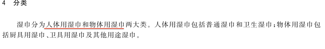 这里面的湿巾,分为人体用湿巾和物体用湿巾——意思就是,不论是擦手的、擦脸的、擦嘴的、擦菊花的,都按照一个标准来执行,没有区别对待。