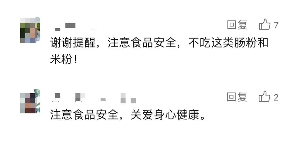还有网友表示,“谢谢提醒,注意食品安全,不吃这类肠粉和米粉”“已转发至相亲相爱一家人群”。