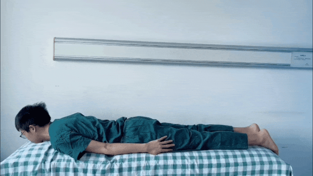 3.飞燕式锻炼:俯卧位,双下肢伸直,两手贴在身体两旁,抬头时上半身向后背伸,每日3组,每组10次。