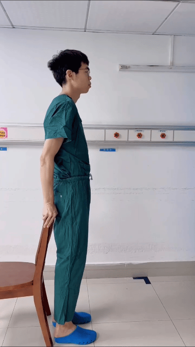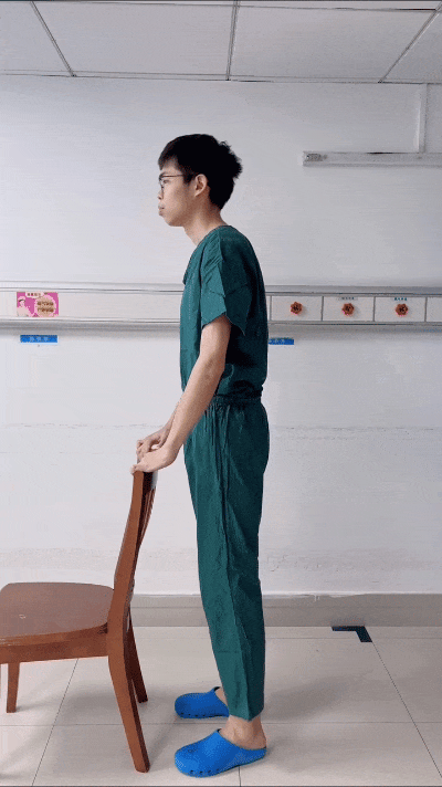 1.髂腰肌及股四头肌训练:手扶椅背,屈髋慢慢伸直小腿,坚持5-10秒,每日3组,每组8-10次。