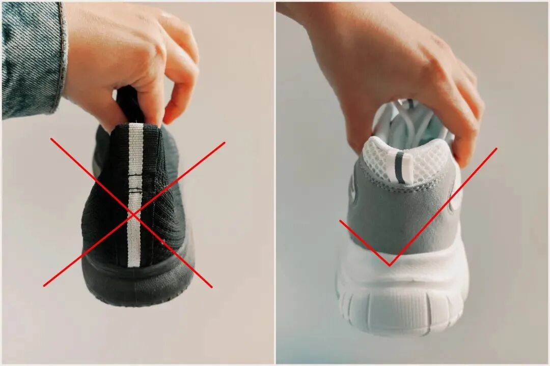 选鞋的时候将鞋尖和鞋跟对折,如果折弯点在鞋底前1/3,对足弓会起到非常好的支撑作用,穿着最为舒适。
