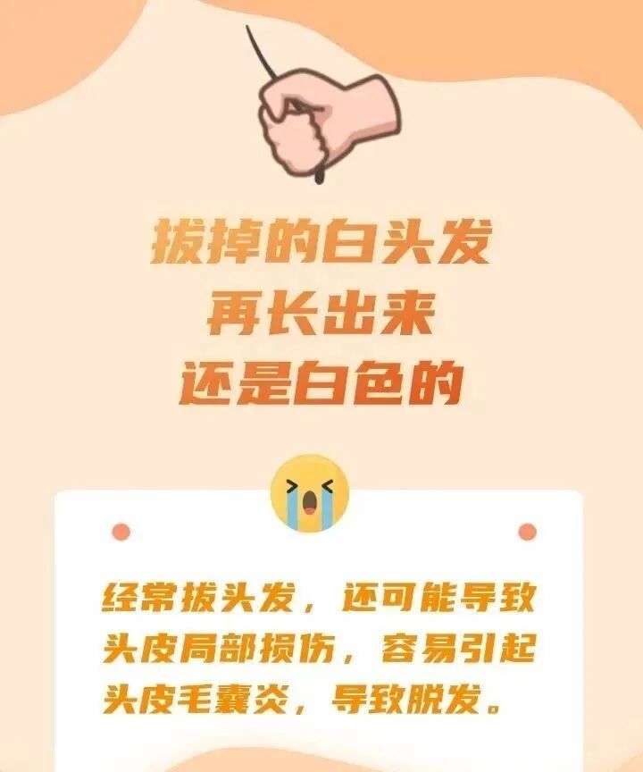 从医学角度看,已经变白的头发基本无法转黑。白头发被拔掉后,长出来的仍是白头发。经常拔白头发,还可能导致头皮局部损伤,容易引起毛囊炎。