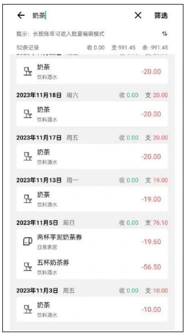 “三个月喝了1000元的奶茶,如果10元的话平均一天一杯。”