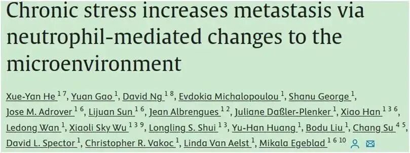 即使是没有癌症,慢性压力也会导致NET(中性粒细胞胞外陷阱)形成,从而改变机体组织。研究人员解释说,“这几乎是在为你的组织患上癌症做准备。”并表示,“减轻压力应该成为癌症治疗和预防的一个组成部分。”