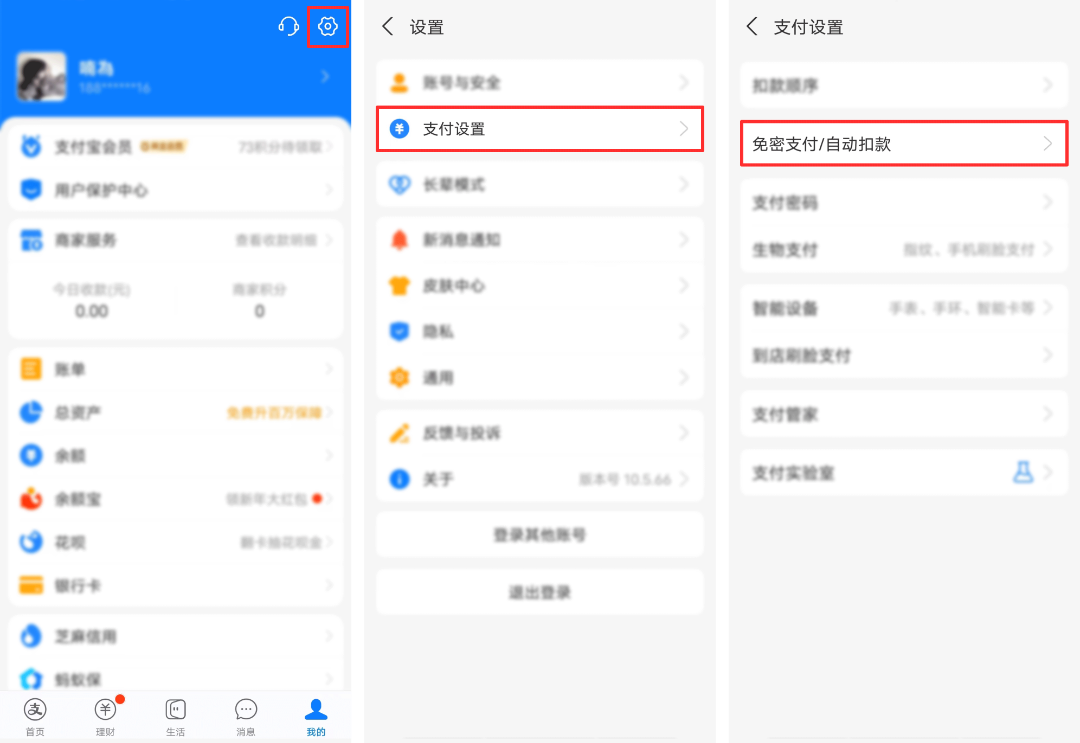 支付宝:打开支付宝,登录个人账户后,依次点击“我的”→右上角“设置”→支付设置→免密支付/自动扣款,选择关闭自动续费签约服务。
