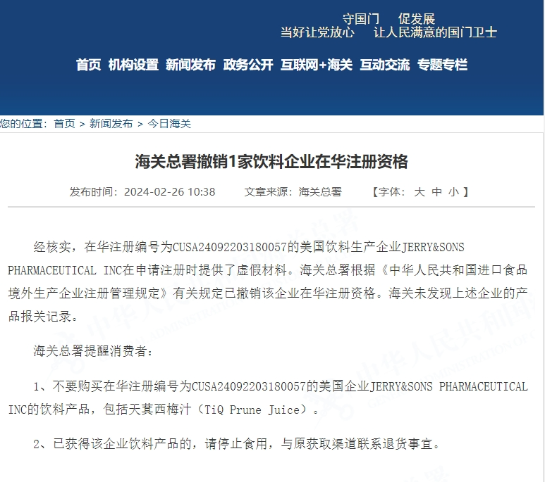 海关总署官网26日发布消息:在华注册编号为CUSA24092203180057的美国饮料生产企业JERRY&SONS PHARMACEUTICAL INC在申请注册时提供了虚假材料。海关总署根据《中华人民共和国进口食品境外生产企业注册管理规定》有关规定已撤销该企业在华注册资格。全文如下: