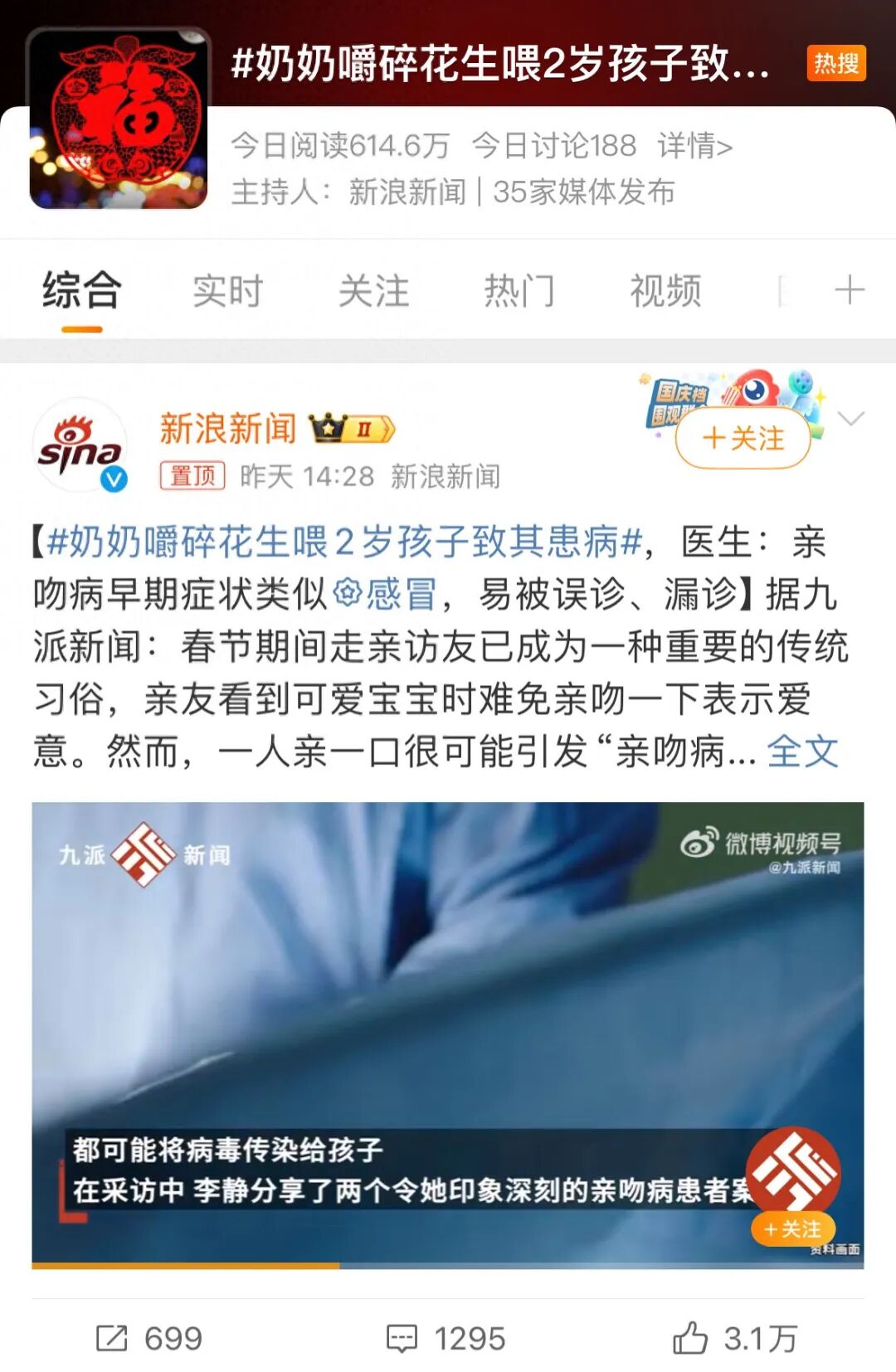 奶奶嚼碎花生喂2岁孩子致其患“亲吻病”