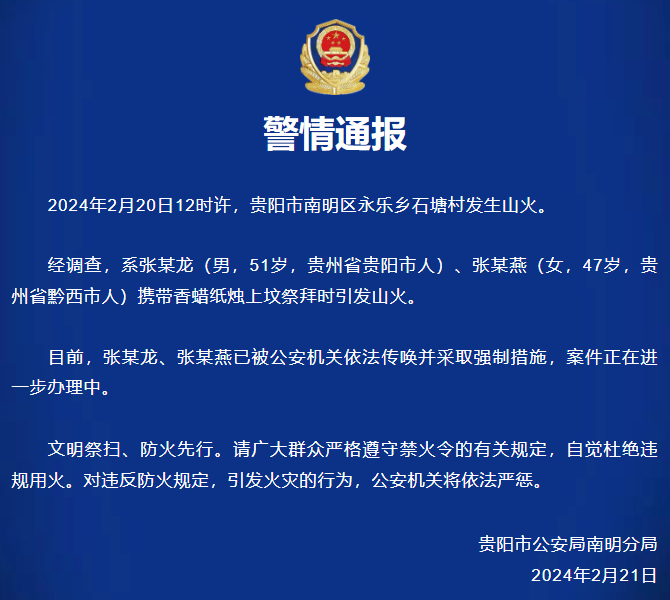 经调查,系张某龙(男,51岁,贵州省贵阳市人)、张某燕(女,47岁,贵州省黔西市人)携带香蜡纸烛上坟祭拜时引发山火。