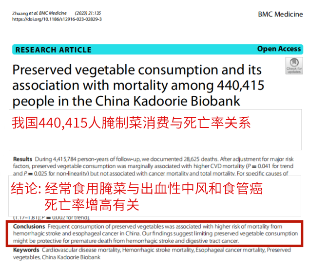 2023年4月,浙江大学医学院团队在《BMC医学》期刊上发表一篇关于腌菜危害的研究。