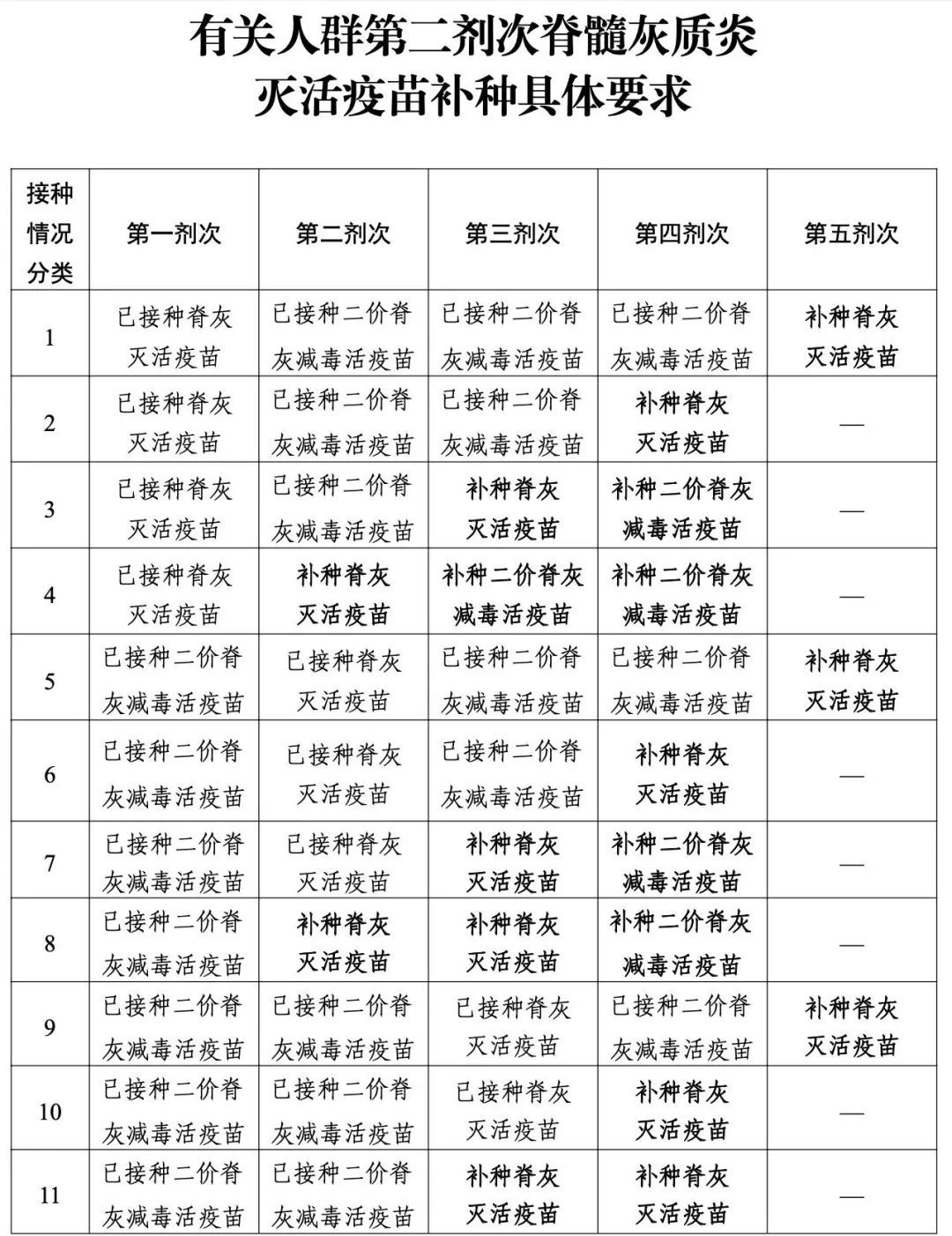 各地要积极推进有关人群第二剂次脊灰灭活疫苗补种工作,通过查询免疫规划信息系统或者预防接种卡(簿)的个案信息和接种记录等方式开展应种人群摸底,采取多种方式通知有关人群监护人;做好疫苗使用计划制定、疫苗采购及供应管理,合理安排工作进度,并于6月30日前完成有关人群第二剂次脊灰灭活疫苗补种工作目标。