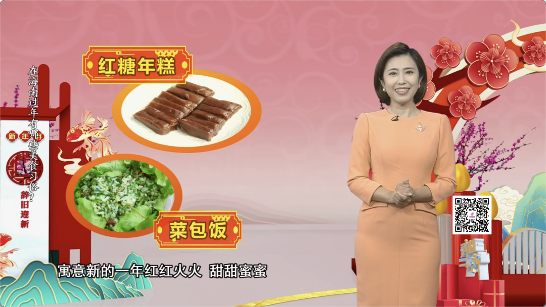 三、红糖年糕,在海南很多地区,红糖年糕是过年必备的节日甜品,寓意新的一年红红火火、甜甜蜜蜜。四、菜包饭。在海南一些乡村,除夕吃菜包饭是重要的习俗之一,寓意团团圆圆。饭团在海南话里叫“饭珍”代表着圆满丰富、全家团圆之意。
