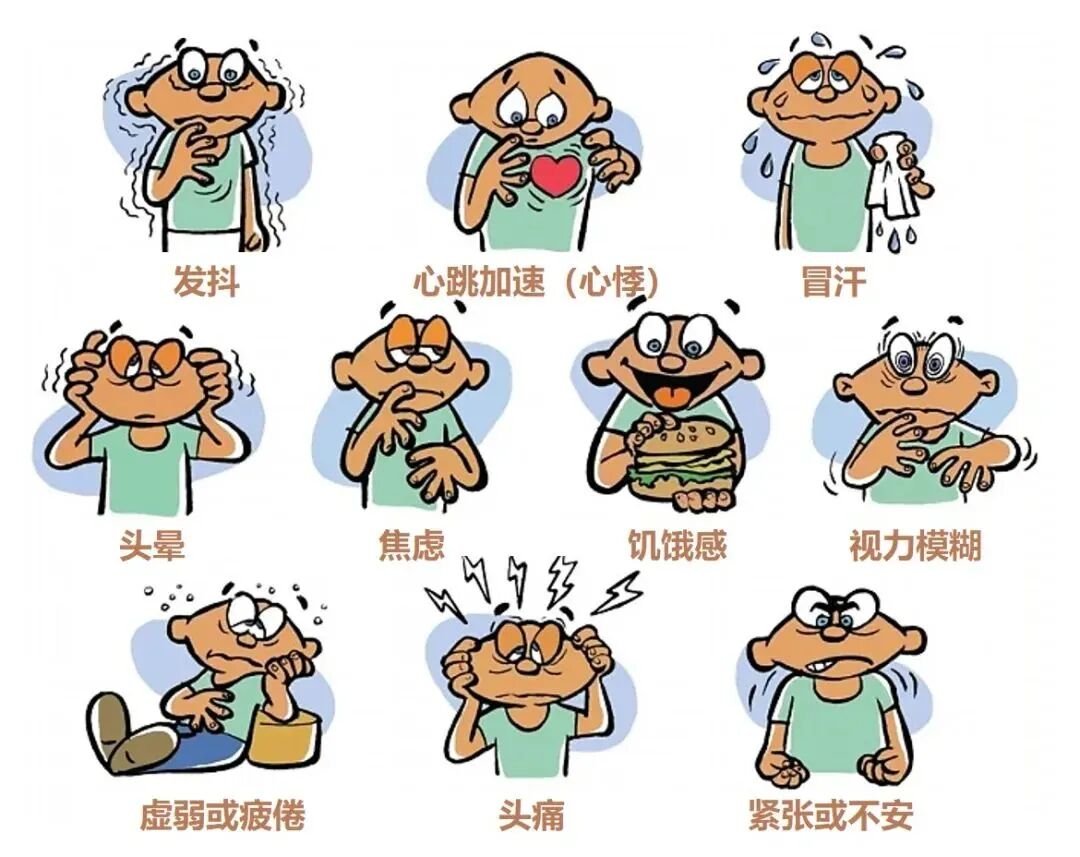 出汗和心慌:这是身体试图通过释放肾上腺素来应对低血糖的表现。