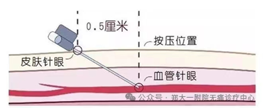 在静脉穿刺时,由于进针的角度及针梗走行方向的不同,针尖刺入血管壁的位置要比皮肤上肉眼所见的位置稍高,皮肤表面的针眼不一定与血管壁上的针眼一致,如果只按压皮肤表面的穿刺点,会因为按压面积过小出现血肿,所以应在皮肤针眼上方约0.5cm处沿着血管的方向纵向按压。