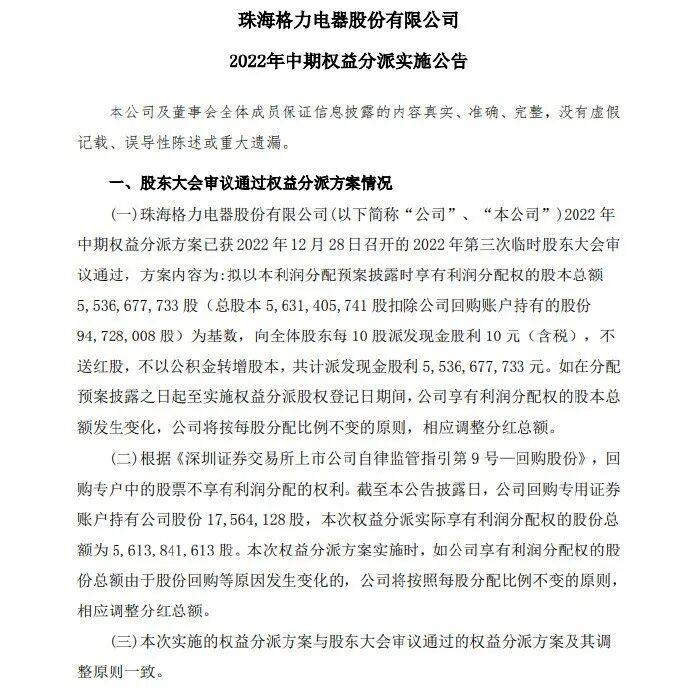 2月21日消息,据格力最新公告,2022年中期权益分派方案为,以公司现有总股本剔除已回购股份1756.41万股后的56.14亿股为基数,向全体股东每10股派10元现金。根据《深圳证券交易所上市公司自律监管指引第9号—回购股份》,回购专户中的股票不享有利润分配的权利。截至本公告披露日,格力电器回购专用证券账户持有公司股份1756.41万股,本次权益分派实际享有利润分配权的股份总额为56.14亿股。