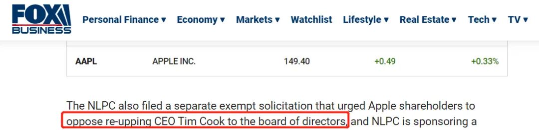 据美媒报道,美国国家法律和政策中心(NLPC)单独提交了一份豁免征求书,敦促Apple股东反对将CEO蒂姆·库克重新任命为董事会成员。