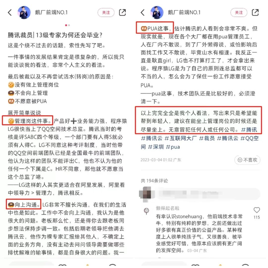 据悉,黄希彤05年入职腾讯,腾讯首个Web前端专家,职级T13,到今年1月还是腾讯前端级别最高专家。黄希彤夫人在“鹅厂前端No.1”这一账号中透露:(黄希彤)在鹅厂打工15年,年前收到裁员通知。并且强调确实“是裁员不是退休”。而被裁以及不再尝试内部转岗的原因则是:没有坐上管理岗位,不会向上管理,不愿意被PUA。