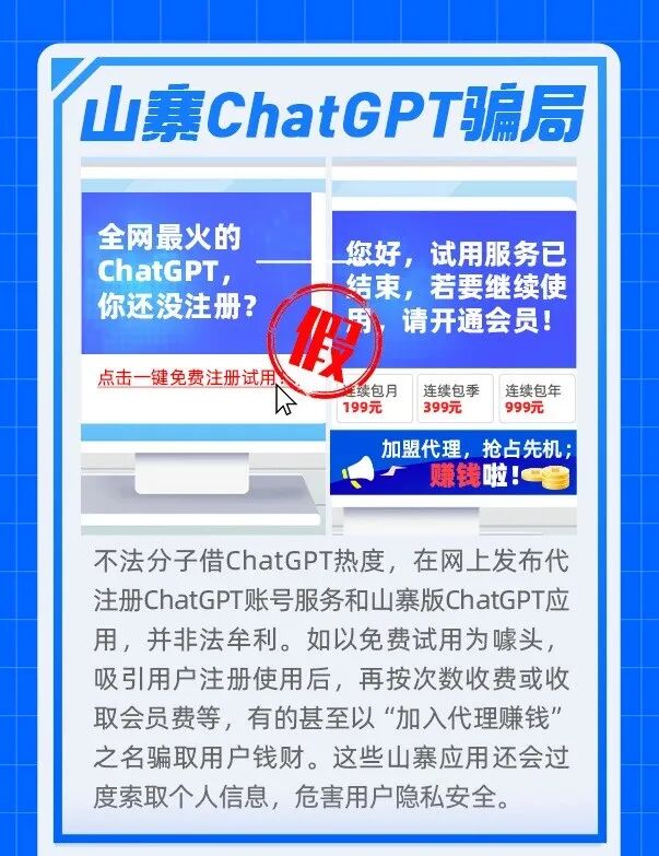据悉,山寨版 ChatGPT 收费套路多,还过度索取注册信息,网友的个人隐私得不到保障。高价代注册 ChatGPT 账号或贩卖 ChatGPT 账号算是黄牛基本套路,一些黄牛还会借机索取网友的身份证、银行卡等身份信息转手贩卖给黑灰产。