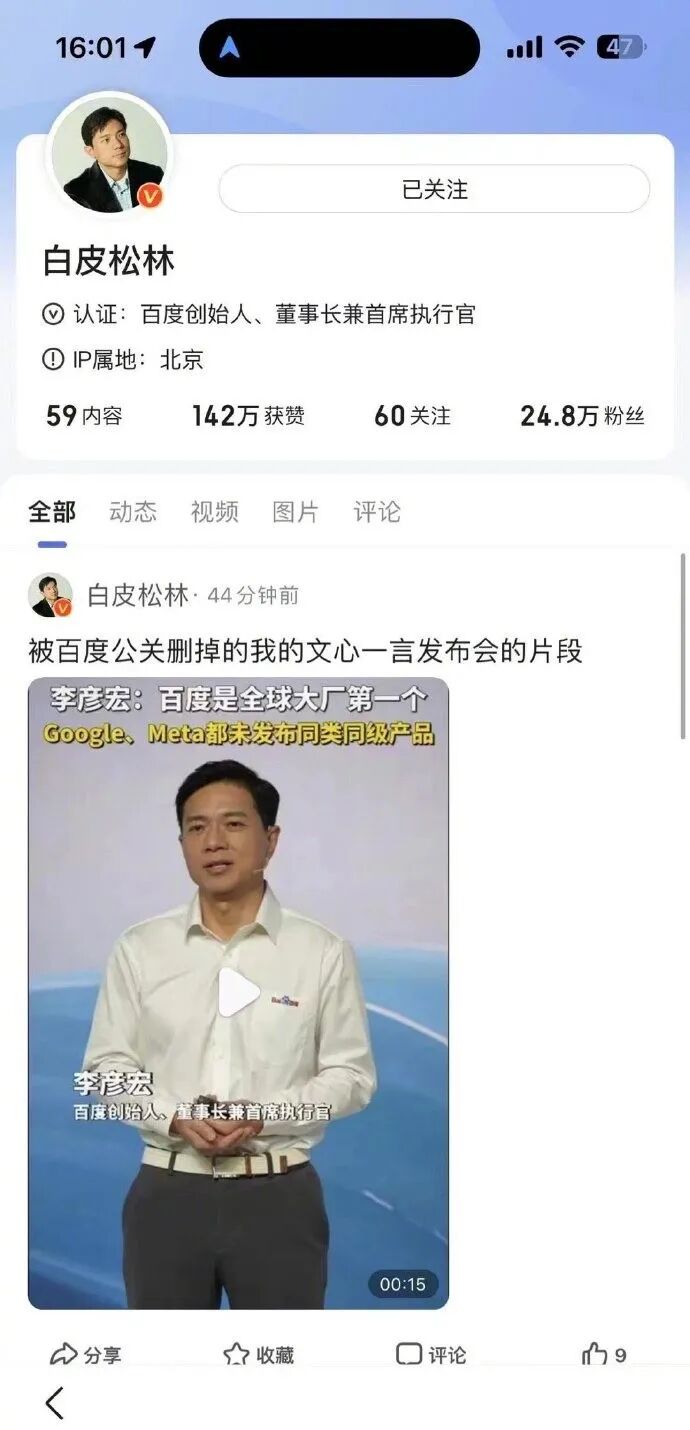 3月20日,员工爆料:李彦宏发帖称被百度公关删掉发言片段。李彦宏在文心一言新闻发布会上表示:百度是全球大厂中第一个发布大语言模型产品的,微软是直接调用OpenAI,Google、Meta都尚未真正发布同类同级产品。