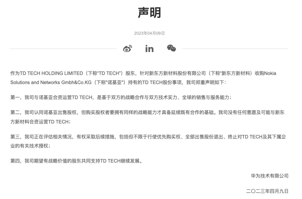 针对新东方新材料收购诺基亚持有的TD TECH股份事项,华为通过官网发表声明称,作为TD TECH的股东,华为认同诺基亚出售股权,但购买股权者要拥有同样的战略能力才具备延续既有合作的基础。华为没有任何意愿及可能与东方材料合资运营TD TECH。华为正在评估相关情况,有权采取后续措施,包括但不限于行使优先购买权、全部出售股份退出、终止对TD TECH及其下属企业的有关技术授权。