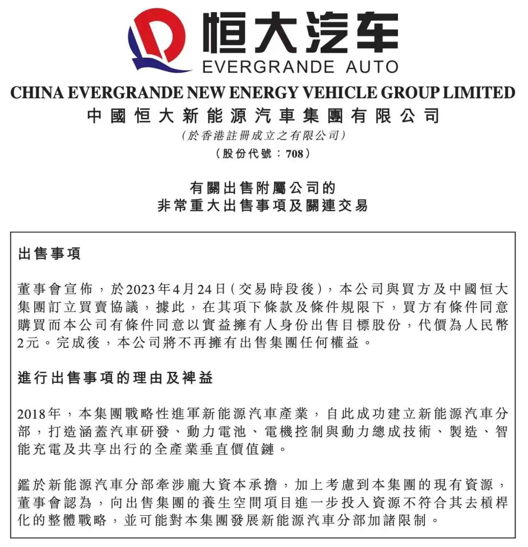值得一提的是,此次公告中,恒大汽车计划将旗下47个养生谷项目以2元的协议价打包出售给恒大股份,同时转移的是247.89亿的债务。恒大汽车称将得以专注发展新能源汽车业务。鉴于新能源汽车需要投入庞大资本,考虑到恒大汽车当前的资源情况,该公司董事会认为,对养生谷等项目进一步投入资源不符合去杠杆化的整体战略,并可能对新能源汽车的业务发展造成限制。